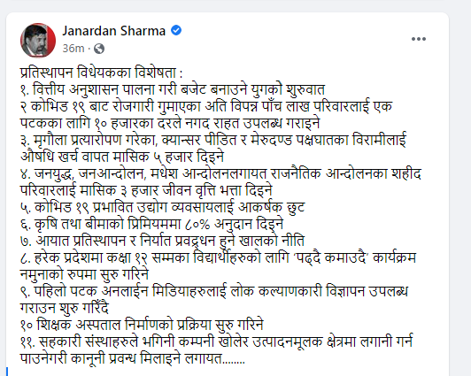 २. कोभिड १९ बाट रोजगारी गुमाएका अति विपन्न पाँच लाख परिवारलाई एक पटकका लागि १० हजारका दरले नगद राहत उपलब्ध गराइने