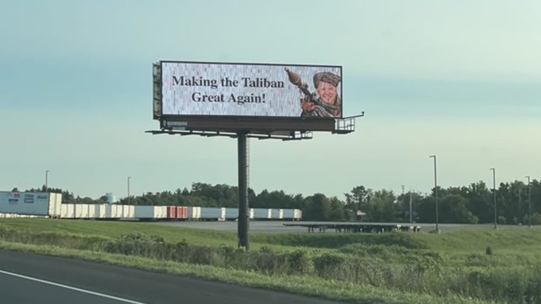 २० वर्ष लामो युद्ध अन्त्य गर्दै अफगानिस्तानबाट लथालिंग तरिकाले अमेरिका फर्किएको केही समयपछि पेन्सलभेनियामा अमेरिकी राष्ट्रपति जो बाइडेनलाई नै तालिबानजस्तो बनाएर होडिङ बोर्ड राखिएका हुन्। होडिङ बोर्डमा बाइडेनलाई तालिबानको जस्तो पहिरन लगाइएको छ भने उनले रकेट लन्चर पनि बोकेको देखाइएको छ।
