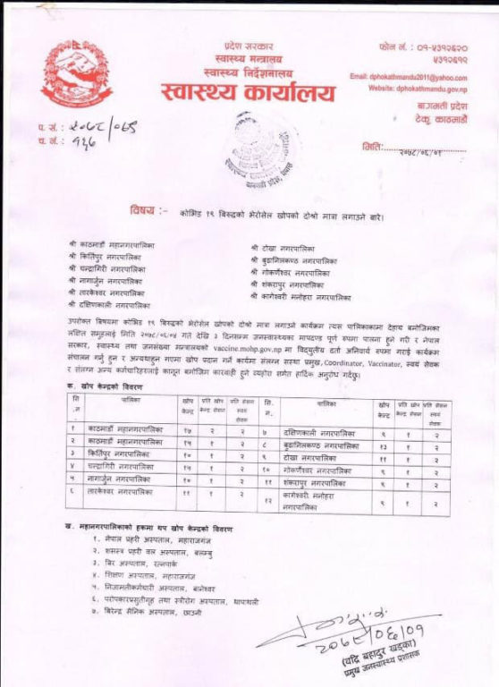 मन्त्रालयका अनुसार काठमाडौं महानगरपालिकाको हकमा नेपाल प्रहरी अस्पताल, महाराजगञ्ज, शसस्त्र प्रहरी अस्पताल, बलम्बु, बीर अस्पताल, रत्नपार्क, शिक्षण अस्पताल, महाराजगञ्ज, निजामती कर्मचारी अस्पताल बानेश्वर, परोपकार प्रसूतीगृह, स्त्रीरोग अस्पताल, थापाथली र वीरेन्द्र सैनिक अस्पताल, छाउनीमा खोप केन्द्र तोकिएको छ ।काठमाडौंको कुन ठाउँमा खोप लगाइँदैछ भन्नेबारेमा सूची तल उल्लेख गरिएको छ ।