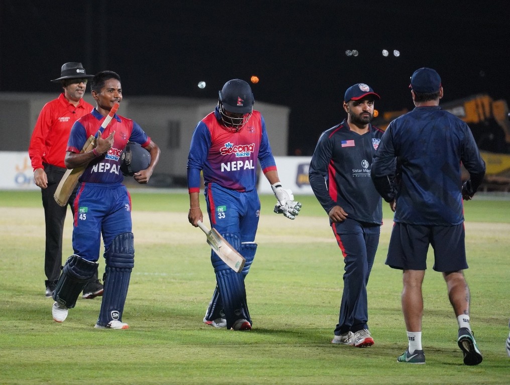 कुशल मल्ल भने शून्यमै आउट भए। यसअघिका चार खेलमा कुशलले तीन खेलमा एक रन र एक खेलमा चार रन मात्र जोड्न सकेका थिए।सोमपाल कामी २ रनमा आउट हुँदा करण केसीले ११ बलमा २ चौका हिर्काउँदै १२ रन जोडे। सन्दीप लामिछाने १२ बल खेलेर ११ रनमा आउट भए। बलिङमा अमेरिकाका सौरभ नेत्रभाल्करले ४ विकेट लिए। केल फिलिप्सले ३ विकेट हात पारे।