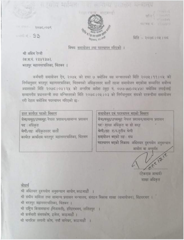 मन्त्रिपरिषद्को निर्णयकै आधारमा त्यसको पाँच दिनपछि सामान्य प्रशासन मन्त्रालयले २३४२३७ कर्मचारी समायोजन नम्बर भएका रेग्मीलाई अख्तियार दुरुपयोग अनुसन्धान आयोग टंगालमा समायोजन वा पदस्थापन गरिदिएको छ । आफ्नो छोरालाई संघमा ल्याउनकै लागि शाखा अधिकृतको अन्तर्वार्तासमेत दिएर बसेका ६३१ जना परीक्षार्थीको भविष्य नै अन्योलमा पार्नेगरी अध्यक्ष रेग्मीले काम गरेको प्रशासन क्षेत्रका जानकारहरु बताउँछन् ।
