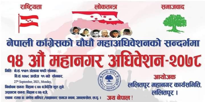 काठमाडौं, १० असोज । नेपाली कांग्रेसले ललितपुरका एक महानगर, दुई नगर र तीन गाउँपालिकामा सोमबार अधिवेशन गर्दैछ। केन्द्रीय निर्वाचन समितिले वडा अधिवेशन ललितपुरमा प्रविधिक कारण देखाएर सोमबारका लागि सारिएको हो । ‘नेपाली कांग्रेस केन्द्रीय निर्वाचन समितिले निर्धारण गरेको पालिकाहरुको यही असोज ९ गते हुने भनिएको अधिवेशन प्राविधिक कारणले असोज ११ गते हुने जानकारी गराउँदछौं,’ जिल्ला सभापति मदनबहादुर अमात्यले असोज ७ गते जारी गरेको विज्ञप्तिमा उल्लेख गरिएको छ । ललितपुर जिल्ला अन्तर्गत ललितपुर महानगरपालिका, गोदावरी नगरपालिका, महालक्ष्मी नगरपालिका, कोन्ज्योसोम गाउँपालिका, बागमती गाउँपालिका र माहाङ्काल गाउँपालिकामा सोमबार एकसाथ पालिका अधिवेशन सुरु हुने सभापति अमात्यले जानकारी दिए।