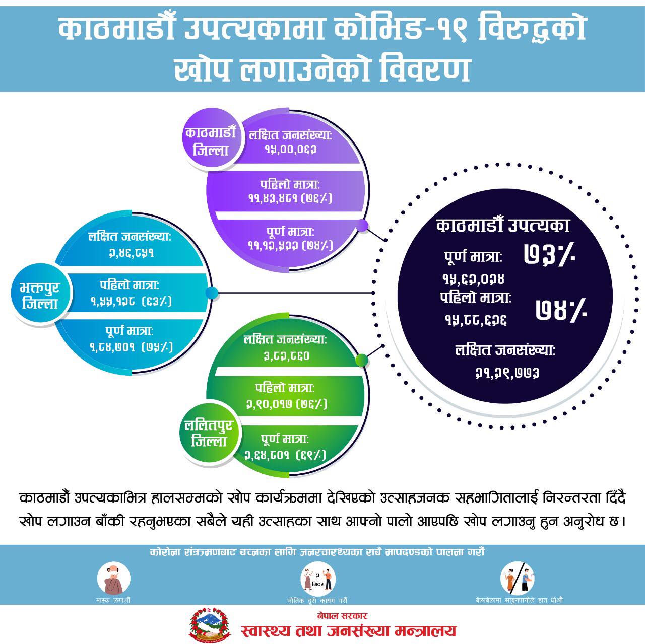 उहाँका अनुसार काठमाडौँ जिल्लामा पहिलो मात्रा ७८ प्रतिशत र पूर्णमात्रा ७४ प्रतिशत जनसङ्ख्याले खोप लगाइसकेका छन् । काठमाडौँमा खोप लगाउने १५ लाख ६३ जना लक्षित रहेका थिए ।
