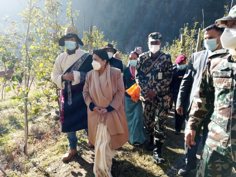 राष्ट्रपति भण्डारी सोमबार मनाङ आएका हुन् । उनले मनाङमा सांसद पाल्देन छोपाङ गुरुङको एग्रो मनाङ प्रालि स्याउ फार्मको अवलोकन भ्रमण गरे । त्यसैगरी गत असारको वर्षाबाट मनाङका केही क्षेत्रमा भएको क्षति र सो बाढी प्रभावित क्षेत्रका बारेमा पनि उनले जानकारी लिएका छन् । राष्ट्रपति भण्डारीले जलवायु परिवर्तनका कारण यस हिमाजी जिल्लामा देखापरेका समस्या र अवस्थाका बारेमा पनि जानकारी लिएका छन् । प्रतिनिधिसभा सदस्य पोल्देन छोपाङ गुरुङले सञ्चालन गर्दै आएको एग्रो मनाङ प्रालि नेपालकै सबैभन्दा ठूलो स्याउ फार्म हो । यहाँ इटालीबाट बिरुवा ल्याएर गाला, फुजी, गोल्डेन जातका स्याउ लगाइएको छ । ७३५ रोपनी क्षेत्रफलमा उक्त फार्म सञ्चालनमा छ ।