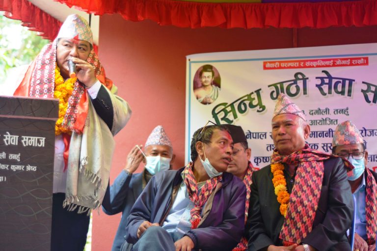 तनहुँको व्यास नगरपालिका–३ स्थित सिन्धु गुठी सेवा समाजले आइतबार आयोजना गरेको कार्यक्रमलाई सम्बोधन गर्दै श्रम, रोजगार तथा सामाजिक सुरक्षामन्त्री कृष्णकुमार श्रेष्ठ ।