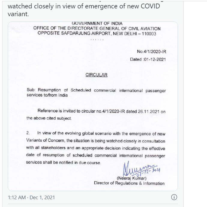 भारतको नागरिक उड्डयन महानिर्देशनालयले बुधबार एक परिपत्र जारी गर्दै ओमिक्रोनबाट उत्पन्न पछिल्लो अवस्थालाई नजिकबाट नियालिरहेको र भारतबाट वा यसतर्फ हुने अन्तर्राष्ट्रिय व्यावसायिक उडान शुरु गर्ने मितिबारे उपयुक्त समयमा जानकारी गराइने महानिर्देशनालयले जारी गरेको परिपत्रमा उल्लेख छ ।
