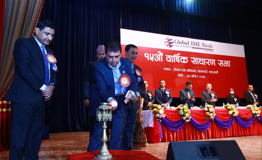 काठमाडौं, २७ मंसिर । नेपालकै सबैभन्दा ठूलो बैंक ग्लोबल आईएमई बैंकले आज आफ्नो वार्षिक साधारणसभा सम्पन्न गरेको छ। साधारणसभाले आफ्ना सेयरधनीलाई दिन प्रस्ताव गरेको साढे १३ प्रतिशत लाभांशसहित बैंकको जारी तथा चुक्ता पुँजी बढाउनको लागि प्रबन्धपत्र, नियमावली संशोधन गर्न सञ्चालक समितिलाई अख्तियारी दिने लगायतका प्रस्तावहरुमाथि पनि छलफल गरी पारित गरेको हो।