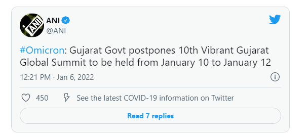 काठमाडौं, २२ पुस । भारतको गुजरातमा जनवरी १० देखि १२ सम्म आयोजना गरिएको भाइब्रेन्ट गुजरात समिट स्थगित भएको छ ।भारतीय सञ्चार माध्यम एएनआईले ओमिक्रोन भेरियन्टका कारण गुजरात सरकारले समिट स्थगित गरेको उल्लेख गरेको छ ।भारतमा पछिल्लो समय कोरोना भाइरसको नयाँ भेरियन्ट ओमिक्रोनको संक्रमण तीव्र रुपमा फैलिएको छ । भारतीय राष्ट्रिय कांग्रेससहितका विपक्षी दलले भाइब्रेन्ट गुजरात समिट रोक्न माग गरेका थिए ।