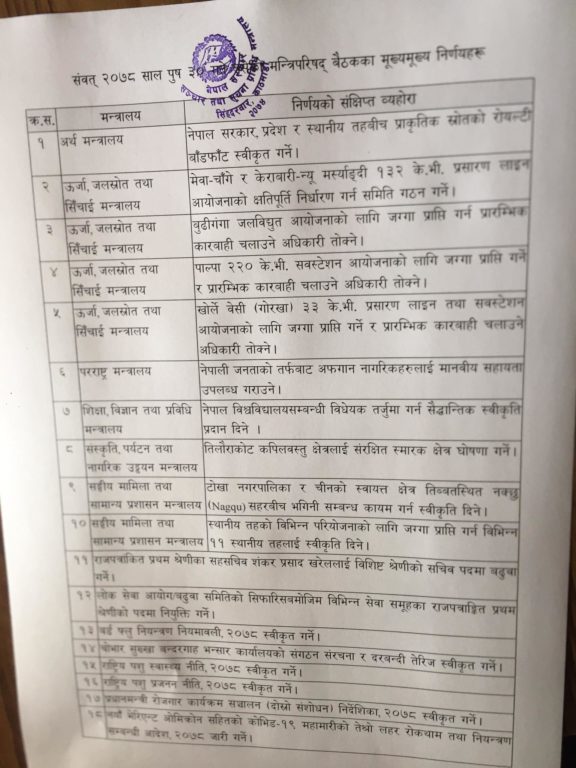 मन्त्रिपरिषद् बैठकका १८ निर्णय (सूचीसहित)