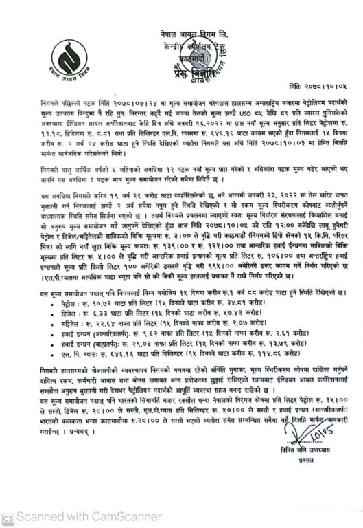 निगमकाअनुसार पेट्रोलको मूल्य ३ रुपैयाँले बढेर १३९ रुपैयाँ पुगेको छ । डिजेल र मट्टीतेलमा पनि ३ रुपैयाँ बढेर १२२ रुपैयाँ पुगेको छ । आन्तरिकतर्फको हवाइ इन्धनको मूल्ये ५ रुपैयाँले बढेर १०६ र अन्तर्राष्ट्रिय हवाइ इन्धनको मूल्य प्रति किलोलिटर १०० डलरले बढेर ९९५ पुगेको छ ।