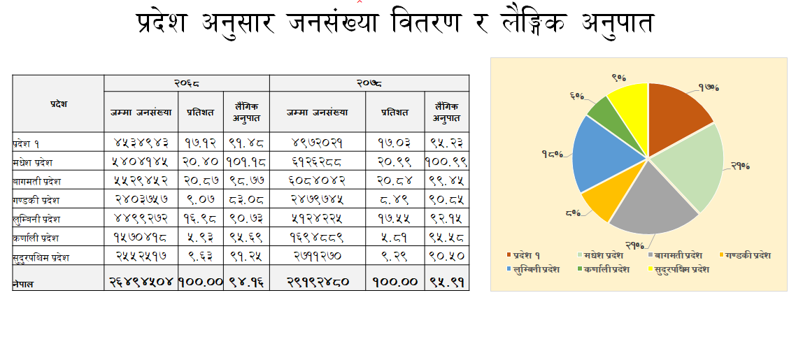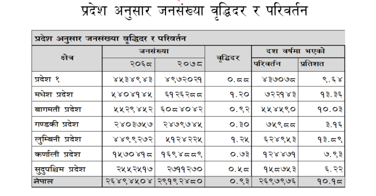 सार्वजनिक तथ्यांक अनुसार यस पटक जनसंख्या गणना प्रदेशगत रुपमा गरिएको थियो । जसअनुसार प्रदेश १ मा ४९ लाख ७२ हजार ०२१, मधेश प्रदेशमा ६१ लाख २६ हजार २८८, बागमतीमा ६० लाख ८४ हजार ०४२, गण्डकीमा २४ लाख ७९ हजार ७४५, लुम्बिनीमा ५१ लाख २४ हजार २२५, कर्णालीमा १६ लाख ९४ हजार ८८९ र सुदूरपश्चिममा २७ लाख ११ हजार २७० जनसंख्या रहेको छ।