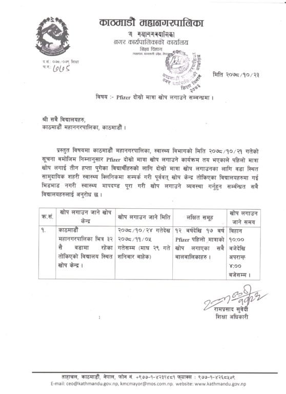 काठमाडौं महानगरभित्रका विद्यार्थीलाई आजदेखि कोरोनाविरूद्ध दोस्रो मात्रा खोप दिइने