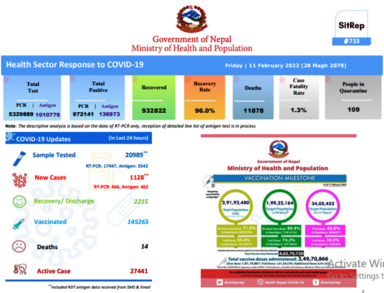यस्तै पछिल्लो २४ घण्टामा पीसीआर र एन्टिजेन गरी २० हजार नौ सय ८९ जनाको नमुना परीक्षण गर्दा कुल परीक्षण गरिएका नमुनाको पाँच दशमलव ३७ प्रतिशत एक हजार एक सय २८ जनामा सङ्क्रमण पुष्टि भएको हो । यस्तै पछिल्लो २४ घण्टामा दुई हजार दुई सय १५ जना निको भएका छन् । हाल नेपालमा २७ हजार चार सय ४१ जना कोरोना भाइरसका सक्रिय सङ्क्रमित रहेका छन् । एक लाख ४५ हजार दुई सय ६५ जनाले कोरोनाविरुद्धको खोप लगाएका छन् त्यस्तै कम्तीमा एक मात्रा खोप लगाउनेको सङ्ख्या एक करोड ८१ लाख १९ हजार र पूर्ण मात्रा लगाउनेको सङ्ख्या एक करोड ६१ लाख ५९ हजार जना पुगेको छ ।