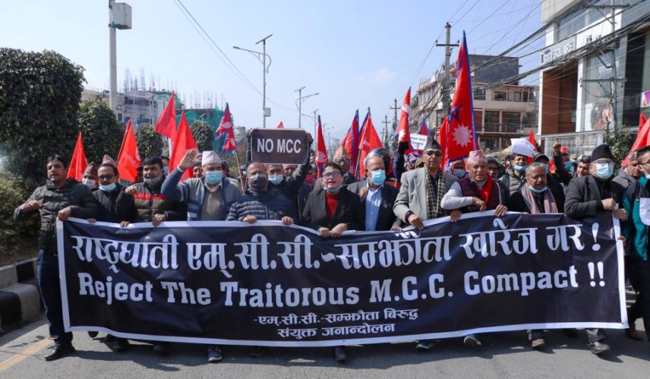 “राष्ट्रघाती एमसीसी सम्झौता खारेज गर” को ब्यानर सहित विभिन्न २२ दलको संयुक्त गठबन्धनले विरोध प्रदर्शन गरेको हो । उनीहरुले एमसीसी सम्झौता खारेज गर, एमसीसी चाहिँदैन-देश बेच्न पाइदैन, नेपाल विदेशी स्वार्थका लागि परेड खेल्ने ठाउँ होइन लगायतका नारा लगाउँदै प्रदर्शनमा उत्रिएका थिए । विराेध प्रदर्शनमा नेकपा (मसाल), नेकपा (क्रान्तिकारी माओवादी), नेकपा (माले), राष्ट्रिय जनमोर्चा, नेपाल, देशभक्त जनगणतान्त्रिक मोर्चा, नेपाल कम्युनिस्ट पार्टी, नेकपा (माओवादी केन्द्र), राष्ट्रिय जागरण मञ्च लगायत सहभागीहरू रहेका थिए ।