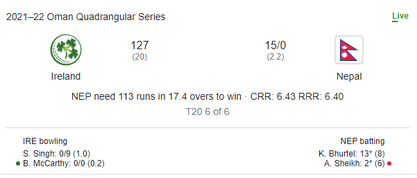 अल अमिरात क्रिकेट मैदानमा टस हारेर ब्याटिङ गरेको आयरल्यान्डले निर्धारित ओभरमा सबै विकेट गुमाएर एक सय २७ रन बनायो । आयरल्यान्डका जर्ज डोकरेलले २८, कर्टिस च्याम्परले २० र कप्तान एन्डी बलविरनेईले १९ रन बनाए भने बलिङतर्फ नेपालका लागि दीपेन्द्रसिंहले ऐरीले चार विकेट लिए । दीपेन्द्रले ४ ओभरमा २१ रन दिएर ४ विकेट लिए । यस्तै अभिनाश बोहराले दुई विकेट लिँदा कमल ऐरी, जितेन्द्र मुखिया र कप्तान सन्दीप लामिछानेले समान एक–एक विकेट लिएका छन् । विश्व कप क्रिकेटको ग्लोबल छनोटअघि चार देश (नेपाल, आयरल्यान्ड, ओमान र यूएई) बीच टी–२० क्रिकेट शृङ्खला हुन लागेको हो । यो शृङ्खलालाई नेपालले अर्को हप्तादेखि ओमानमै सुरु हुने टी-२० विश्व कप छनोटको पूर्ण तयारीका रूपमा लिइएको छ ।