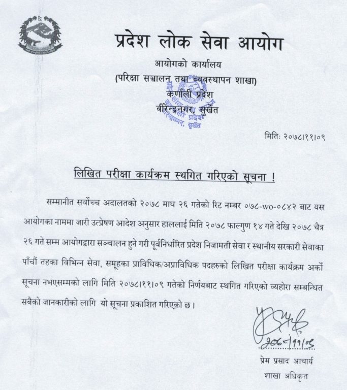 सर्वोच्च अदालतद्वारा आयोगका नाममा जारी गरेको उत्प्रेषण आदेशानुसार यही फागुन १४ देखि चैत २६ गतेसम्म सञ्चालन हुने पूर्वनिर्धारित प्रदेश निजामती सेवा र स्थानीय सरकारी सेवाका विभिन्न सेवा समूहका प्राविधिक–अप्राविधिक पदको लिखित परीक्षा स्थगनको सूचना प्रकाशन गरिएको छ । आयोगको विज्ञापन समावेशी नभएको भन्दै गत माघ २६ गते सर्वोच्च अदालत रिट निवेदन दायर गरिएको थियो । आयोगका शाखा अधिकृत प्रेमप्रसाद आचार्यले अर्को सूचना नभएसम्मका लागि आयोग लिने सबै पदको लिखित परीक्षा स्थगन गरिएको बताए । कर्णाली प्रदेश लोकसेवा आयोगले गत पुस २७ गते अप्राविधिक–प्राविधिक पाँचौँ तहको खुला तथा समावेशी प्रतियोगात्मक लिखित परीक्षाको विज्ञापन गरेको थियो ।