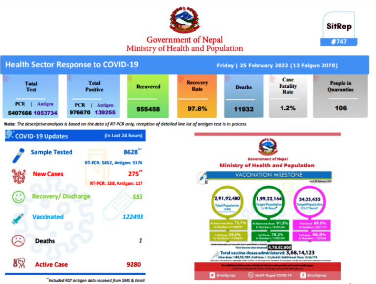 काठमाण्डौ, १३ फागुन । स्वास्थ्य तथा जनसङ्ख्या मन्त्रालयका अनुसार पछिल्लो २४ घण्टामा नेपालमा दुई सय ७५ जनामा कोरोना भाइरसको सङ्क्रमण पुष्टि भएको छ । पीसीआर र एन्टिजेन गरी आठ हजार ६ सय २८ जनाको नमुना परीक्षण गर्दा दुई सय ७५ जनामा सङ्क्रमण पुष्टि भएको मन्त्रालयले जनाएको छ ।
