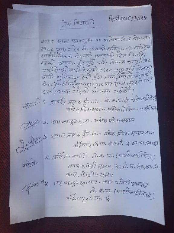 महोत्तरी, २५ फागुन । एमसीसी पारितको विपक्षमा उभिएका माओवादी केन्द्र महोत्तरीका संयोजकसहित पाँच नेताले पार्टी त्यागको घोषणा गरेका छन् ।