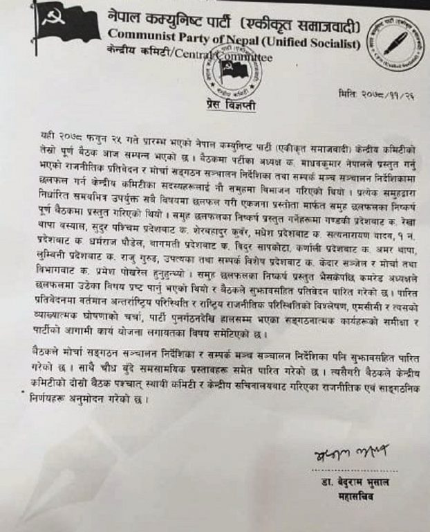त्यस्तै अध्यक्ष माधवकुमार नेपालले बैठकमा पेस गरेको राजनीतिक प्रतिवेदन सुझावसहित पारित गरेको छ । अध्यक्ष नेपालको प्रतिवेदनमाथि नाैँ समूह बनाएर छलफल गरिएको थियो । बैठकबाट १४ बुँदे समसामयिक प्रस्तावसमेत पारित गरेको प्रचार विभाग प्रमुख जगन्नाथ खतिवडाले जानकारी दिए । बैठकले एमसीसीका बारेमा आएका विचार र धारणालाई समेत पार्टीको सम्पत्तिका रुपमा राख्दै आवश्यक पर्दा छलफल गर्न सकिने निर्णय गरेको छ ।