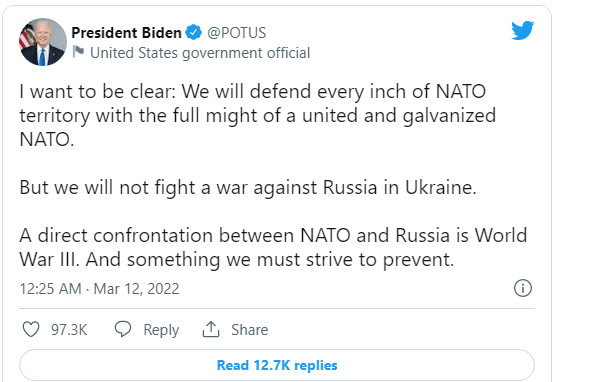 नेटो क्षेत्रको हरेक इन्च जमिन रक्षा गर्न आफूहरू तयार भए पनि युक्रेनमा रुसविरुद्ध युद्ध नलड्ने बाइडेनले बताएका छन् । शनिबार बाइडेनले ट्विट गर्दै भनेका छन्, हामी एक संयुक्त र सशक्त नेटोको पूरा तागतका साथ नेटो क्षेत्रको हरेक इन्चको रक्षा गर्छौँ । त हामी युक्रेनमा रुसविरुद्ध युद्ध लड्ने छैनौँ ।