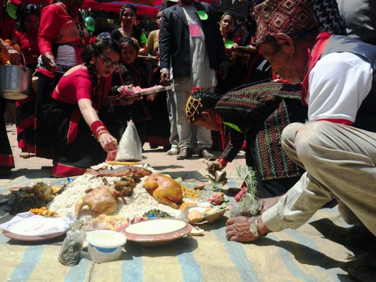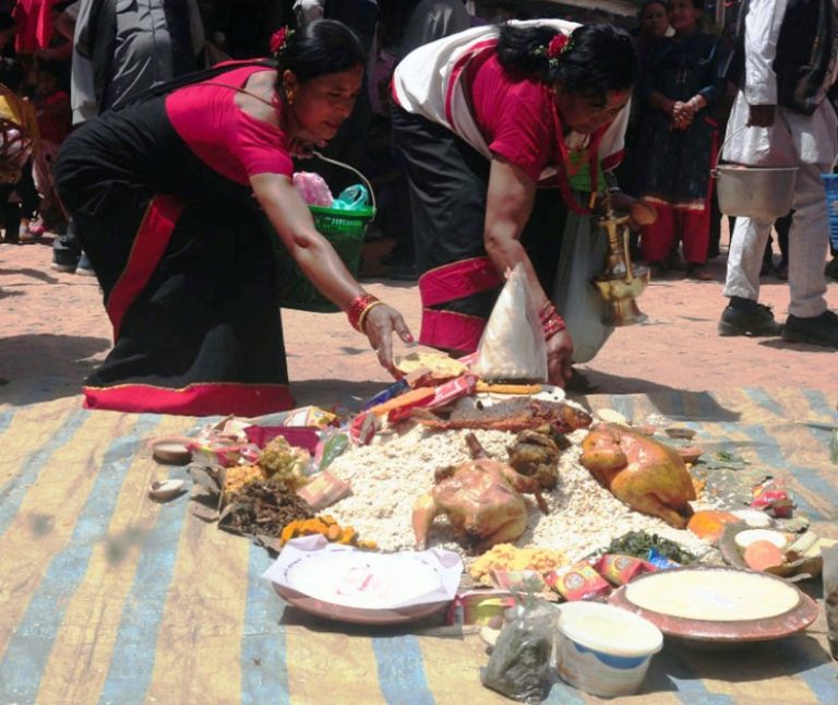 बिस्का जात्राको आठौँ दिन द्यो स्वगं पूजा (भगवानकाे सगुन पुजा) का अवसरमा आइतबार भोज चढाउँदै स्थानीय भक्तजन ।