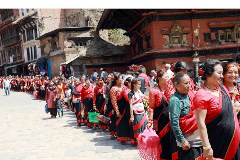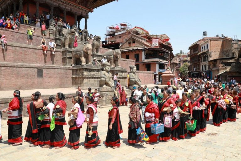 देवतालाई सगुन दिन हाकुपटासीमा सजिएका महिला भक्तपुरको ऐतिहासिक बिस्का जात्राका क्रममा आइतबार द्यःसँग विईगु (देवतालाई सगुन दिने) कार्यक्रममा तःमारी (न्यातपोल परिसर)मा हाकुपटासीमा सजिएका स्थानीय महिला सहभागी ।