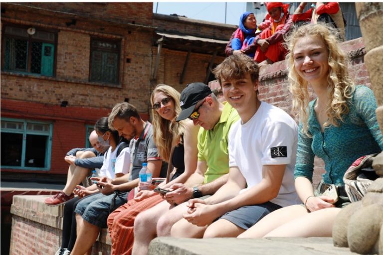 न्यातपोल परिसरमा विदेशी पर्यटक भक्तपुरको ऐतिहासिक बिस्का जात्राका क्रममा द्यःसँग विईगु (देवतालाई सगुन दिने) कार्यक्रममा तःमारी (न्यातपोल परिसर)मा अवलोकन गर्न बसेका विदेशी पर्यटक ।