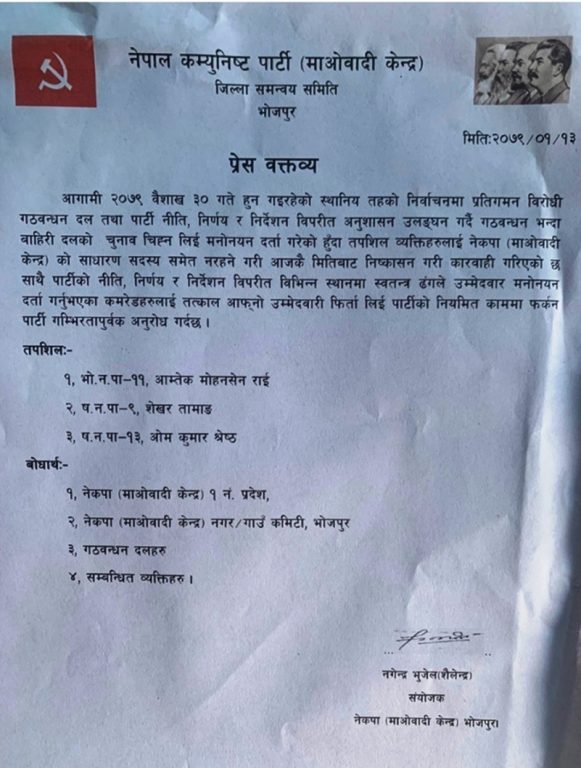 भोजपुर, १३ वैशाख । भोजपुरमा स्थानीय तहको चुनावमा नेकपा एमालेसँग चुनावी तालमेल गर्ने कार्यकर्तालाई नेकपा माओवादी केन्द्रले कारवाही गरेको छ ।