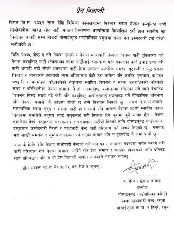 माओवादी केन्द्रबाट दिएको आफ्नो उम्मेदवारी समेत फिर्ता लिनेगरी आफू एमालेमा प्रवेश गरेको उनले उल्लेख गरेका छन्।