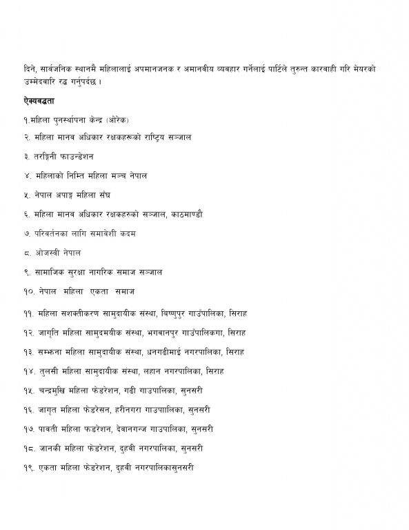 सार्वजनिक कार्यक्रममै स्थापितले प्रश्नकर्ता युवतीलाई आपत्तिजनक निकृष्ट शब्द प्रयोग गरेको उनलाई कारवाही गर्न ती संघसंस्थाले संयुक्त रुपमा विज्ञप्ति जारी गर्दै कारबाही गर्न माग गरेका हुन् ।