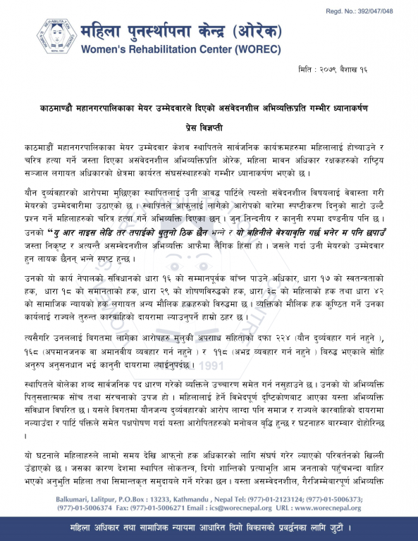 स्थापितले दिएको अभिव्यक्तिप्रति आपत्ति जनाउँदै ४५ वटा महिला मानवअधिकार संघसंस्थाहरुले कारवाहीको माग गरेको हो ।