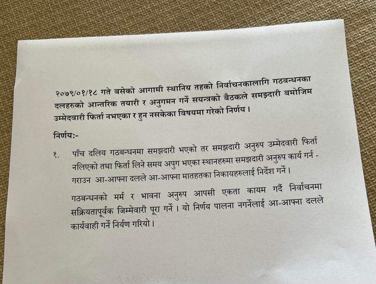 काठमाडौं । पाँच दलीय गठबन्धनले उम्मेदवारी फिर्ता नलिएका र फिर्ता लिने समय अपुग भएका स्थानीय तहमा गठबन्धन दलहरूबीच भएको समझदारीअनुसार तालमेल गर्न आ–आफ्ना दलले मातहतका निकायहरूलाई निर्देशन दिने निर्णय गरेको छ ।