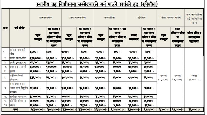 आयोगका अनुसार गाउँपालिका अध्यक्ष वा उपाध्यक्षका उम्मेद्वारले तीन लाख ५० हजार र वडाअध्यक्ष र सदस्यका उम्मेदवारहरूले कम्तिमा एक लाख ५० रुपैयाँभन्दा बढी खर्च गर्न नपाउन गरी उम्मेदवारलाई हदबन्दी तोकिदिएको छ ।