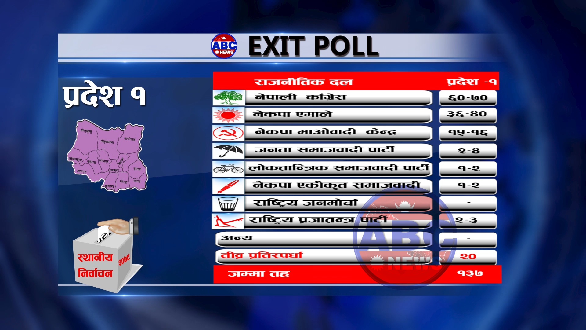 प्रदेश नम्बर १को मत परिणामा पनि एबीसी एक्जिट पोल जस्तै : नेका पहिलो, एमाले दोस्रो र माके तेस्रो (पूरा विवरण)