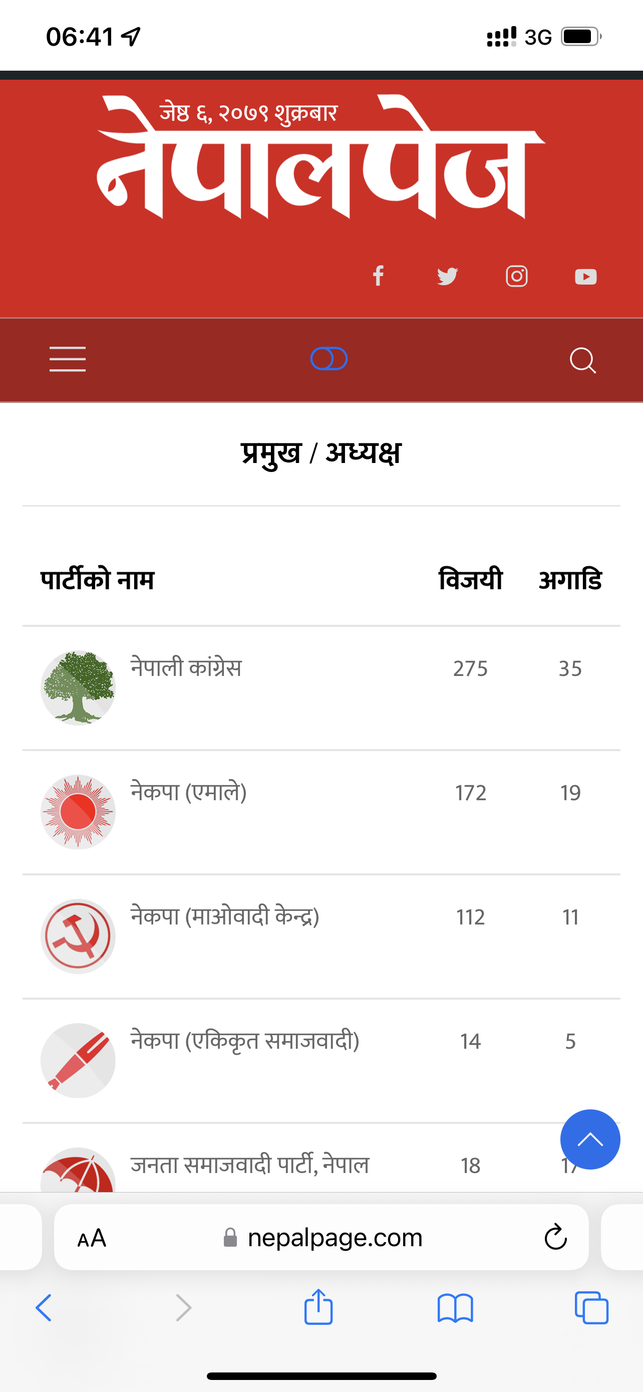 काठमाडौँ | स्थानीय तह निर्वाचन अन्तर्गत शुक्रबार बिहान ६ बजेसम्म ६१७ पालिकाको मतपरिणाम सार्वजनिक भएको छ । वैशाख ३० गते भएको ७५३ स्थानीय तहमा भएको मतदानअनुसार उपमहानगर, नगरपालिका र गाउँपालिका गरी ६१७ स्थानको अन्तिम नतिजा आएको हो ।!