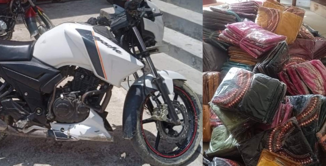 प्रहरी चौकी भिठ्ठामोडवाट गस्तिमा खटिएको प्रहरीले भारतिय नम्बर प्लेटको मोटरसाइकलमा चोर बाटो हुँदै ल्याउदै गरिएको २ बोरा कपडा जलेश्वर धवौलीवाट नियन्त्रणमा लिएको हो ।