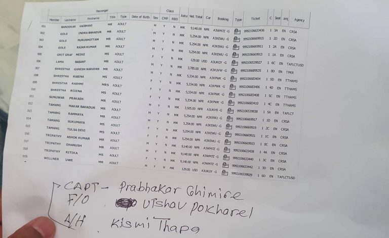 यसैगरी, प्रकाश सुनुवार, मकरबहादुर तामाङ, राममाया तामाङ, सुकुमाया तामाङ, तुलसादेवी तामाङ, अशोककुमार त्रिपाठी, धनुश त्रिपाठी, ऋतिका त्रिपाठी, वी विलनर पनि जहाजमा रहेको खुलेको छ ।
