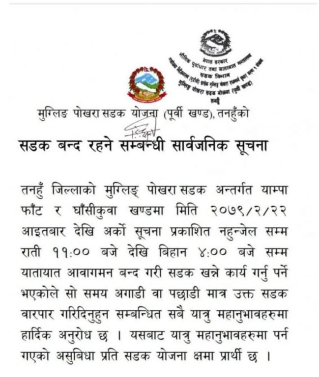मुग्लिङ–पोखरा सडक योजना (पूर्वी खण्ड) तनहुँले एक सूचना जारी गर्दै राति ११ बजेदेखि ४ बजेसम्म आवत जावत बन्द गरिने जानकारी दिएको हो ।
