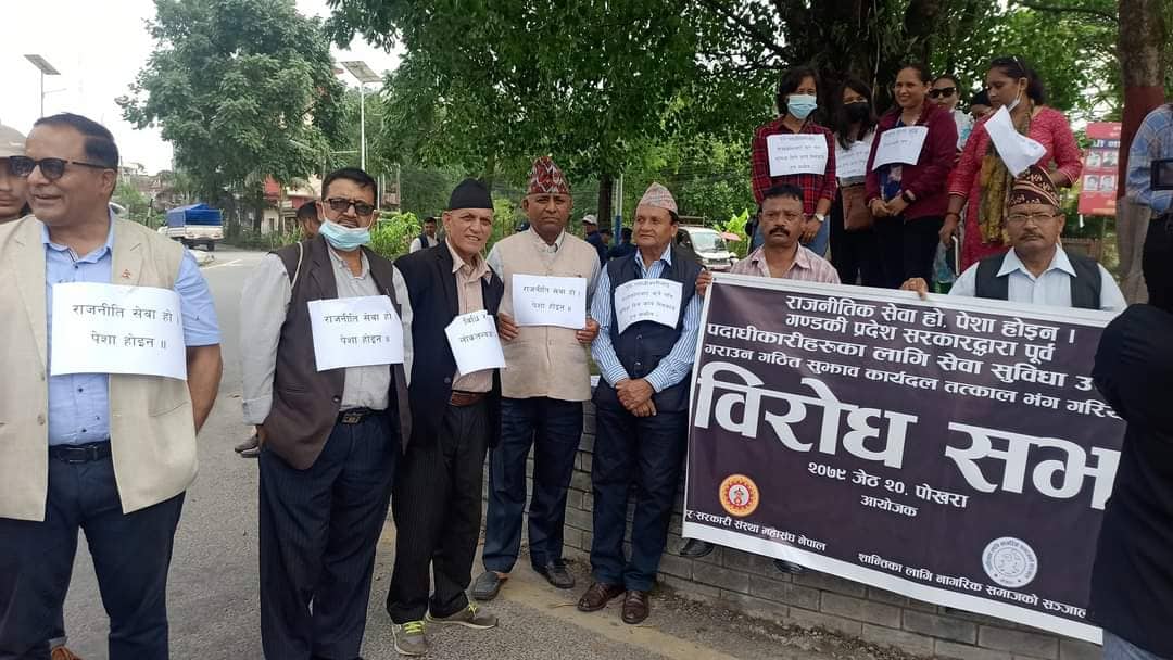 पाेखरा, २० जेठ । गण्डकी प्रदेश सरकारले पूर्वपदाधिकारीलाई सुविधा दिन लागेपछि पाेखरामा विराेध प्रदर्शन भएकाे छ । गैरसरकारी संस्था महासंघ र नागरिक समाजले मुख्यमन्त्री कार्यालय नजिक बिराेध प्रदर्शन गरेकाे हाे ।