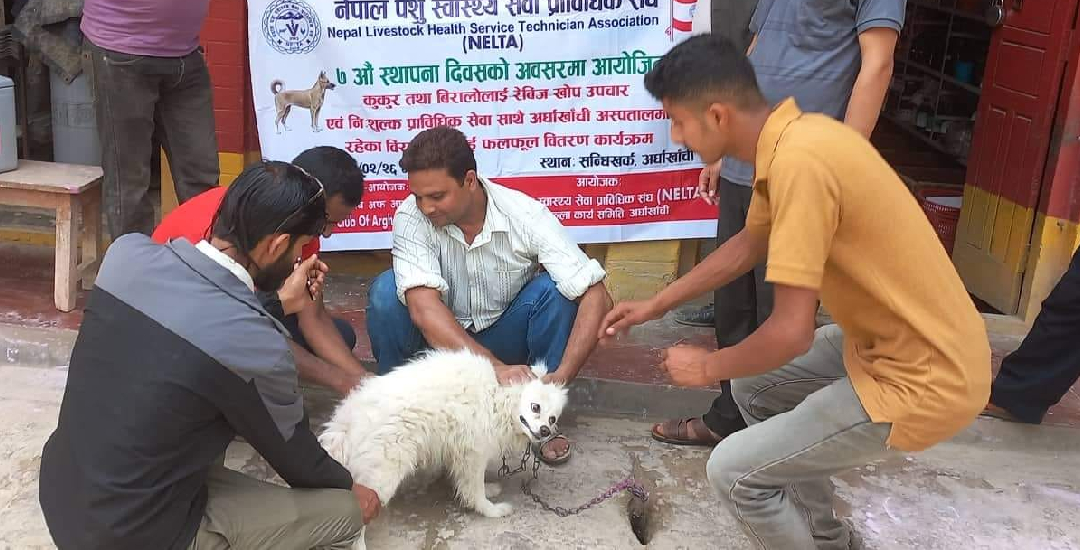 अर्घाखाँची । सन्धिखर्कमा छाडा छोडिएका कुकुरलाई रेविजविरुद्धको निःशुल्क खोप लगाइएको छ । नेपाल पशु स्वास्थ सेवा प्राविधिक संघ (नेल्टा) अर्घाखाँचीका अध्यक्ष प्रदीप आचार्यसहितको टोलीले सन्धिखर्क बजारका मुख्य स्थानमा कुकुरलाई रेविजविरुद्धको खोप लगाएको हो ।