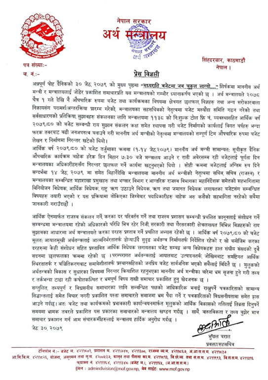 आज अन्नपूर्ण पोस्टमा प्रकाशित ‘मध्यराति बजेटमा जब चुकुल लाग्यो..’ समाचारप्रति ध्यानाकर्षण भएको मन्त्रालयले जनाएको हो ।