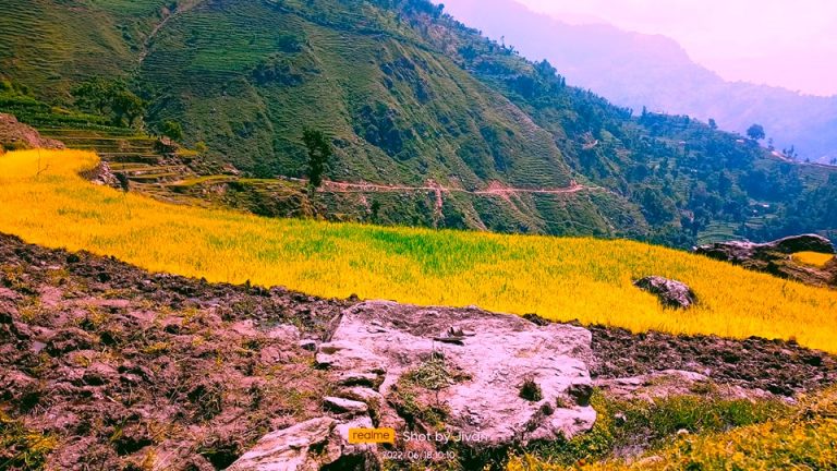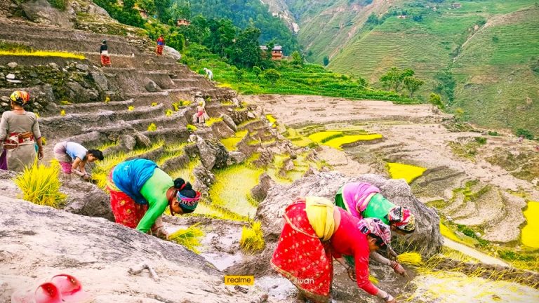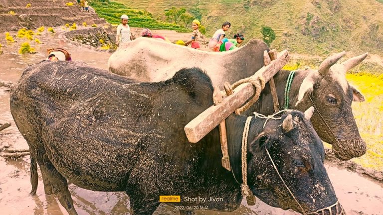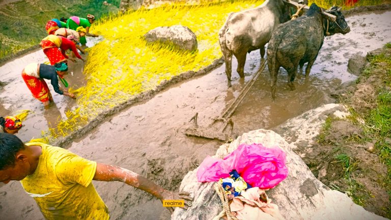 दैलेखको ठाँटीकाँध गाउँपालिका–१ खातीगाउँ सीमधारास्थित खेत रोप्दै रोप्नेरी बाउसे ।