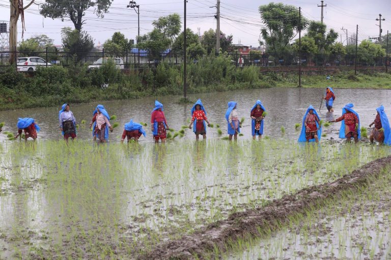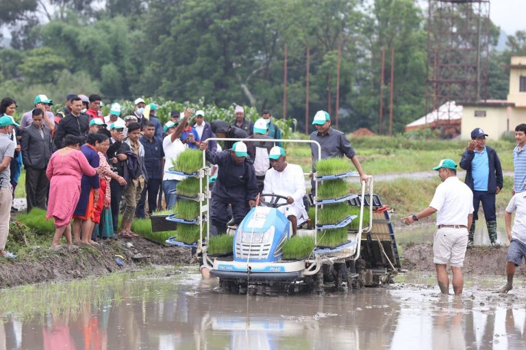काठमाडौं, १५ असार । कृषि तथा पशुपंक्षी विकास मन्त्री महिन्द्र राय यादवले मेसिन चलाएर धान रोपेका छन् ।