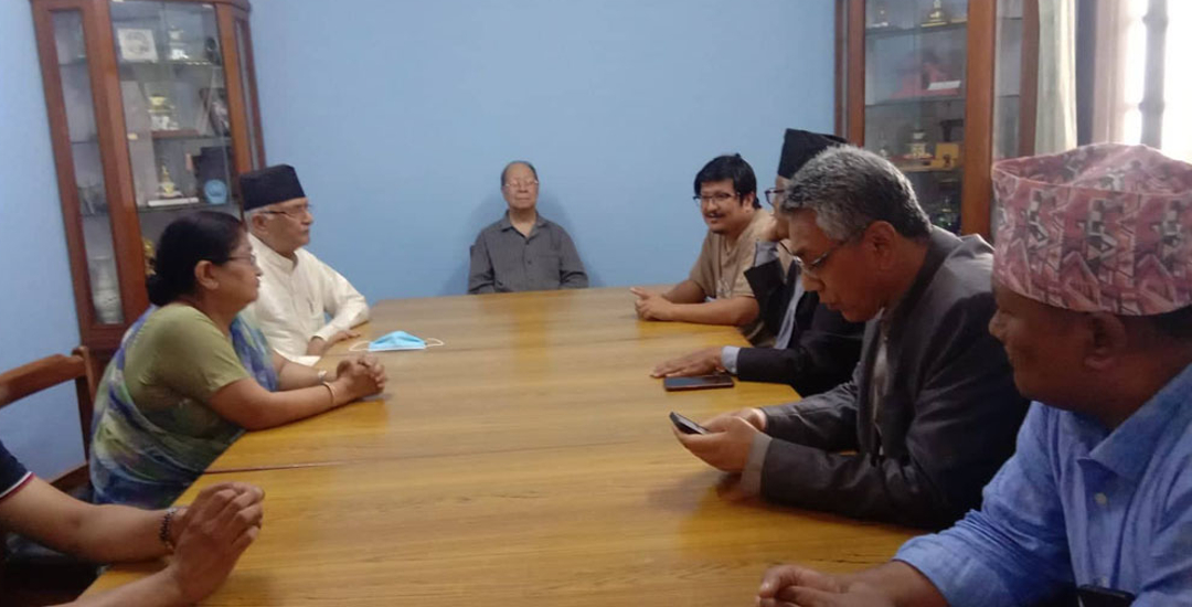 काठमाडौँ । पत्नी वियोगमा रहेका नेपाल मजदुर किसान पार्टीका अध्यक्ष नारायणमान विजुक्छेँलाई भेटेर नेकपा (एमाले)का अध्यक्ष केपी शर्मा ओलीले समवेदना व्यक्त गरेका छन्।