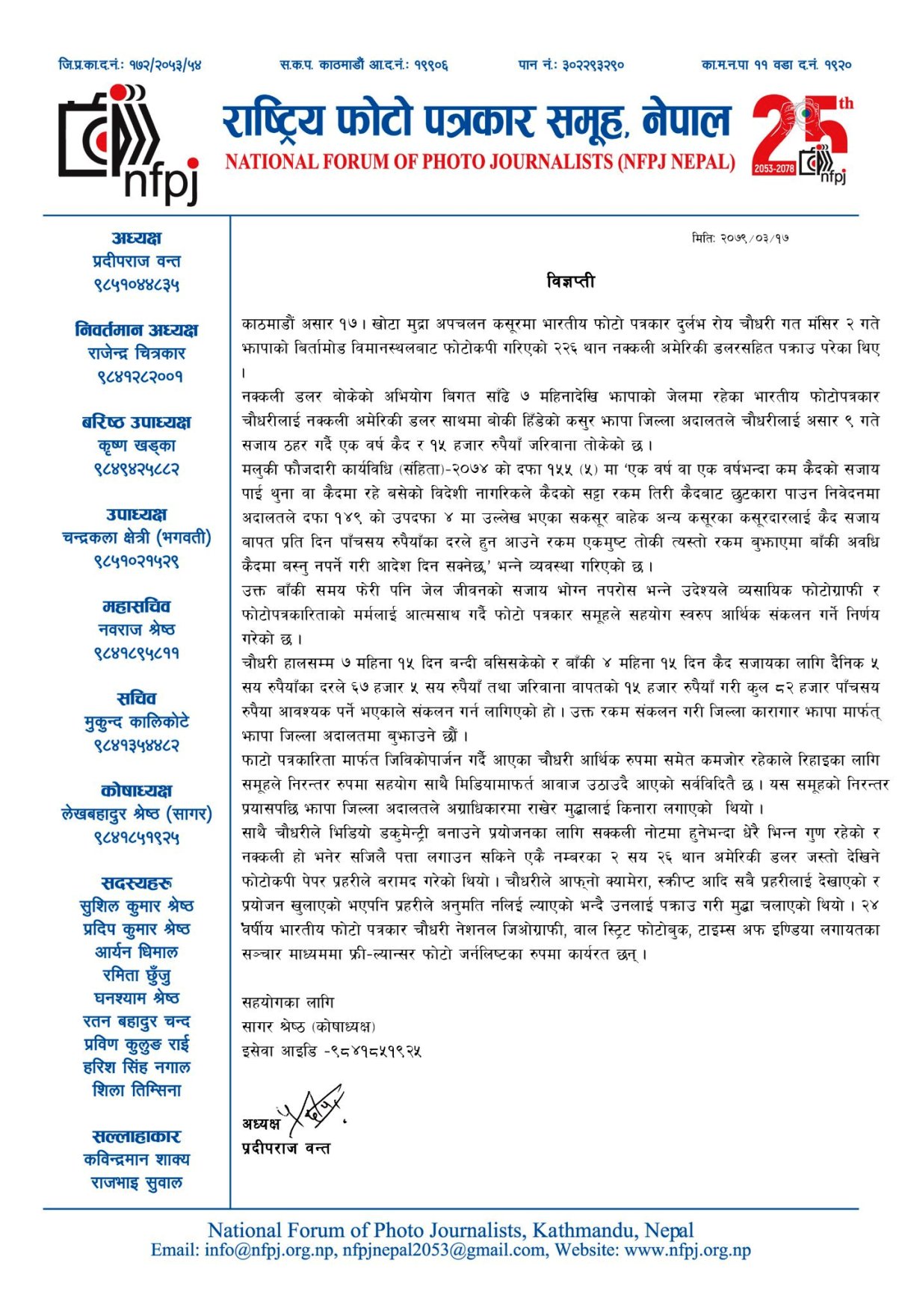 काठमाडौं, १७ असार । नेपाली फोटो पत्रकारहरुको छाता संगठन राष्ट्रिय फोटो पत्रकार समूह (एनएफपिजे) ले भारतीय फोटोग्राफर दुर्लभ रोय चौधरीलाई छुटाउन आर्थिक संकलन गर्ने भएको छ ।
