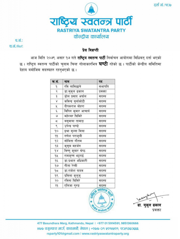 काठमाडौँ । आजमात्रै निर्वाचन आयोगबाट दल दर्ताको प्रमाणपत्र पाएको राष्ट्रिय स्वतन्त्र पार्टीले आफ्ना केन्द्रीय सदस्यहरुको नामावली सार्वजनिक गरेको छ ।