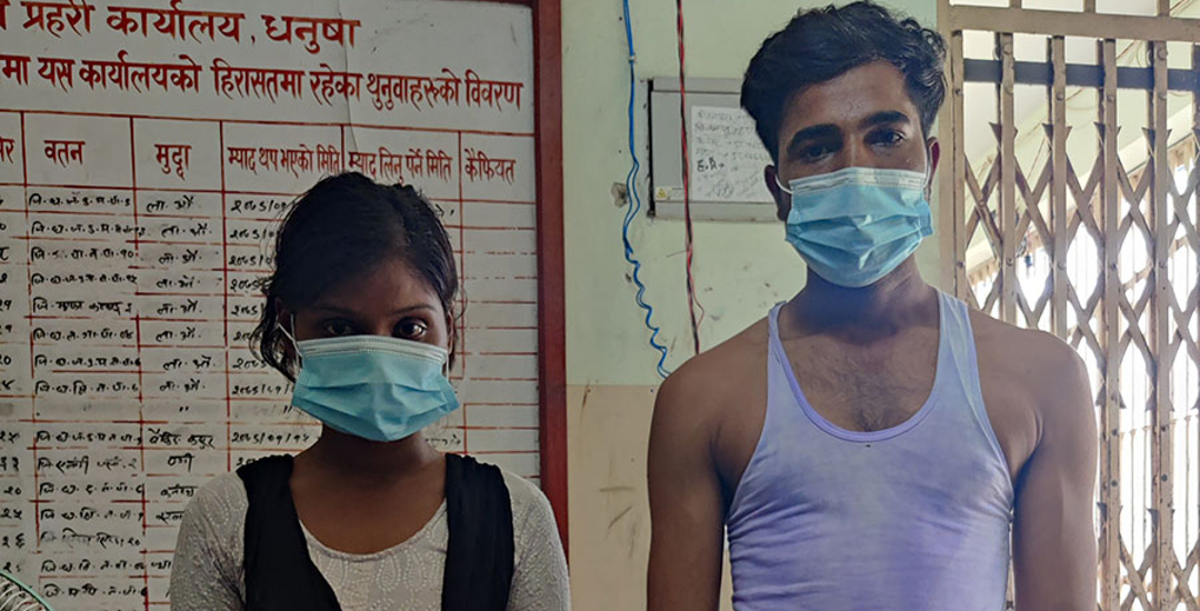 सप्तरीको खडक नगरपालिका वडा नम्बर ८ खोजपुर बस्ने २४ वर्षीया रजनीकुमारी चौधरी र सिरहाको मिर्चैया नगरपालिका वडा नम्बर २ बस्ने ३० बर्षीय आरिफ हुसेनलाई पक्राउ गरिएको जिल्ला प्रहरी कार्यालय धनुषा प्रवक्ता एवं डीएसपी जितेन्द्रकुमार बस्नेतले बताए ।