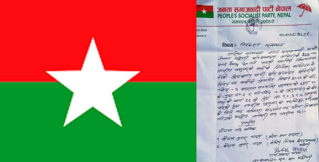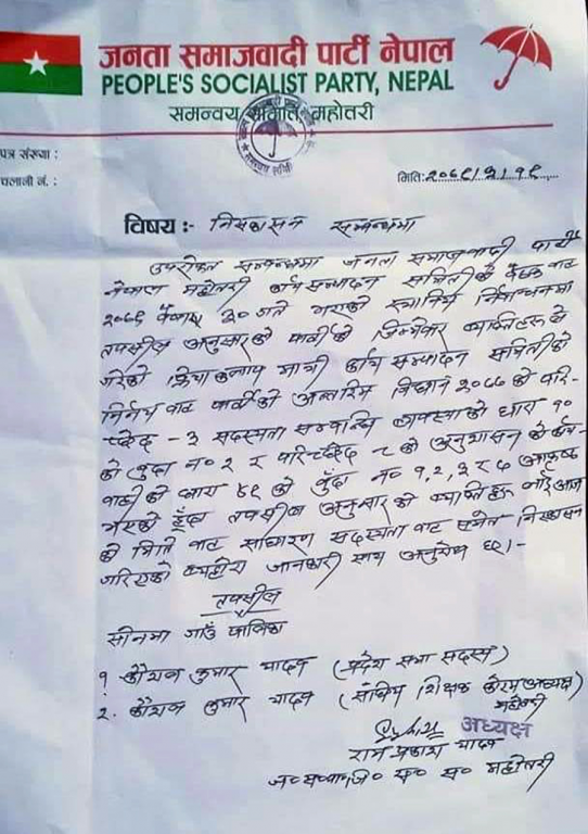 ‘गत ३० वैशाखको स्थानीय तहको निर्वाचनमा पार्टीका जिम्मेवार व्यक्तिहरुले गरेको क्रियाकलापमाथि कार्यसम्पादन समितिको निर्णयबाट पार्टीको अन्तरिम विधान–२०७७ को परिच्छेद–३ सदस्यतासम्बन्धी व्यवस्था धारा १० को बुँदा २ र परिच्छेद–८ को अनुशासनको कारबाहीको धारा ४९ को बुँदा १, २, ३, र ६ आकृष्ट भएको हुँदा आजैको मितिबाट साधारण सदस्यताबाट समेत निष्कासन गरेको व्योहोरा जानकारीका साथ अनुरोध छ’ जिल्ला अध्यक्ष रामप्रकाश यादवले जारी गरेको विज्ञप्तिमा भनिएको छ ।