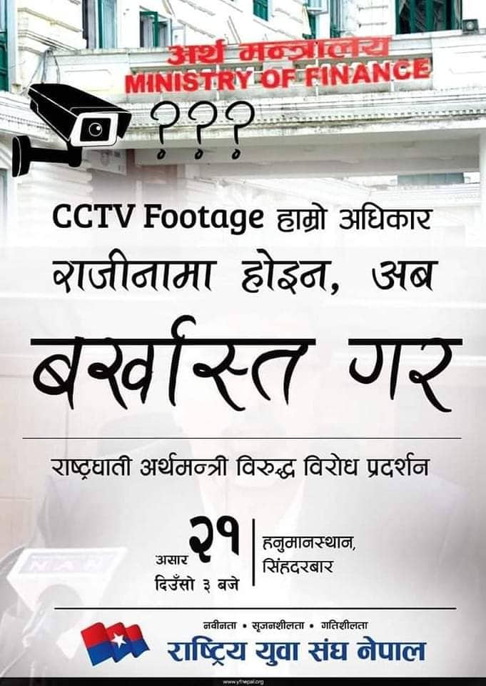 अर्थ मन्त्रालयले बजेट भाषणको अघिल्लो दिनको सीसीटीभी फुटेज ‘डिलिट’ भएको जनाए पछि युवा संघले बर्खास्तको माग गर्दै प्रर्दशन गर्ने भएका हुन । अर्थ मन्त्री जनार्दन शर्माले असम्बन्धित व्यक्तिलाई जेठ १४ गते राती मन्त्रालयमा बोलाएर आफ्नो तर्फबाट भन्दै करका दर परिवर्तन गराएको आरोप लाग्दै आएको छ ।