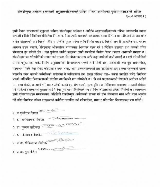 काठमाडौँ । राष्ट्रिय योजना आयोगका ६ जना पूर्वउपाध्यक्षहरुले बजेट निर्माणका क्रममा अनुशासनहीन क्रियाकलाप भएको भन्दै छानबिन गर्न माग गरेका छन् ।